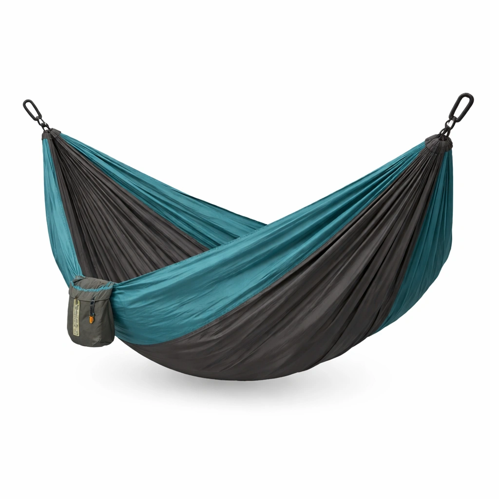 Hamaca confeccionada con nylon de alta resistencia. Dimensiones: 300 cm de largo por 200 cm de ancho. Capacidad de carga hasta 200 kg. Incluye mosquetones y bolsa de transporte adjunta.